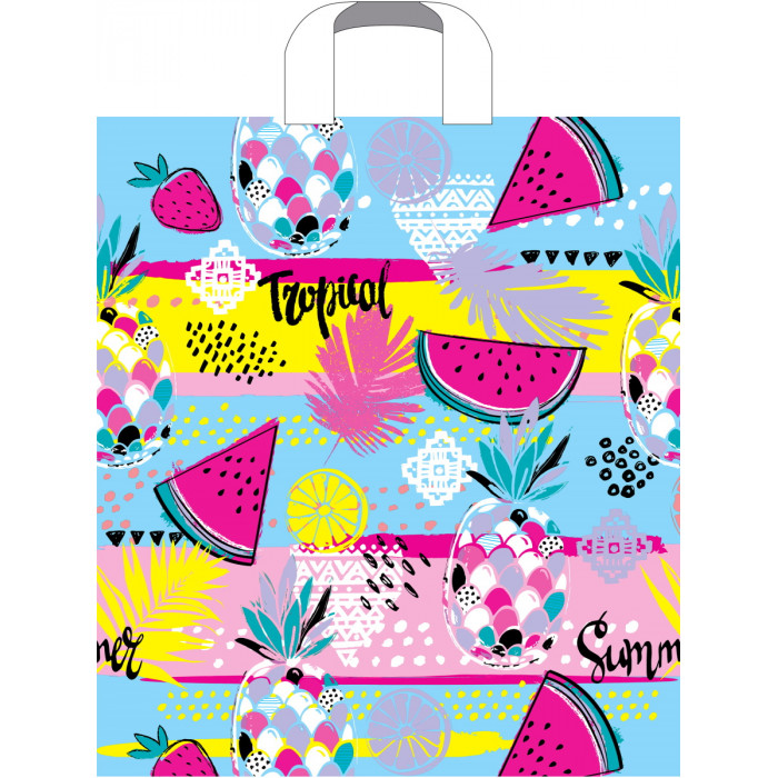 Стильно и недорого. Уникальный дизайн. Пакет полиэтиленовый петлевой Тропические фрукты 38х42/37мкм Тематика: Общепоздравительные