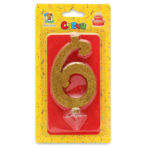 Свеча для торта Золотой глиттер (большая) Цифра 6 С-1898