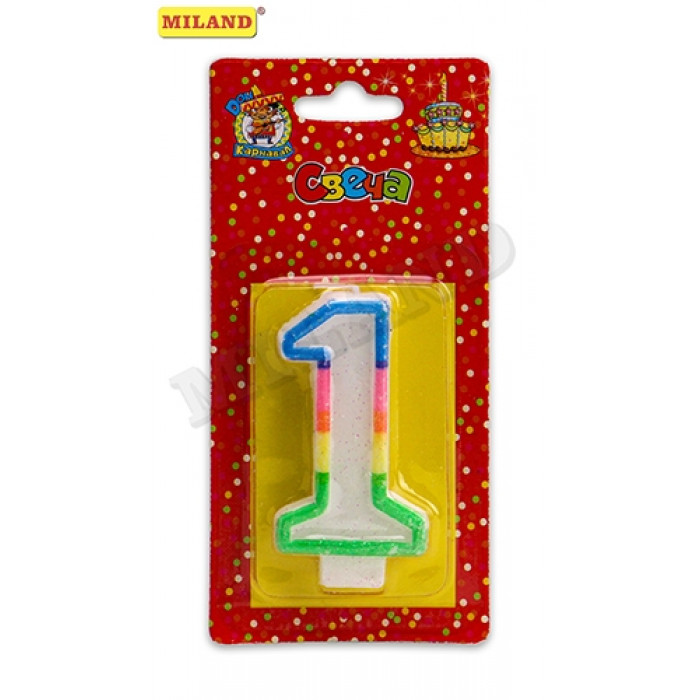 Стильно и недорого. Уникальный дизайн. Свеча для торта с разноцветной окантовкой с блестками Цифра 1 Тематика: Общепоздравительные