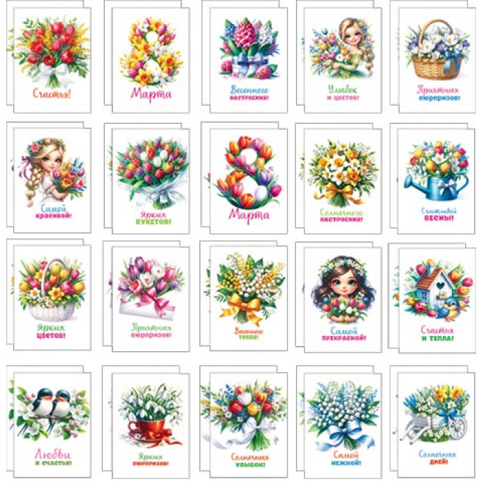 Стильно и недорого. Уникальный дизайн. Набор мини-открыток "Весеннее настроение" (40 шт.) Тематика: 8 Марта