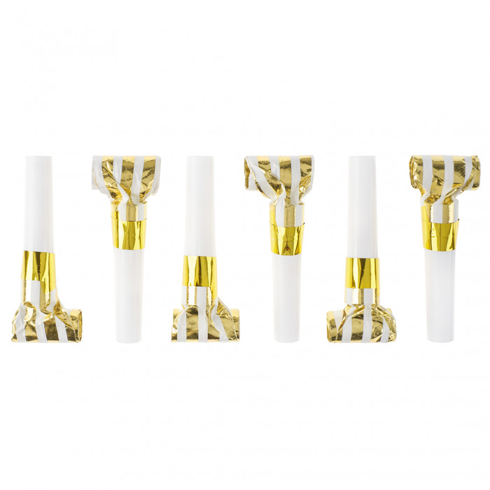 Карнавальные язычки гудки, Полосы, Белый/Золото, Металлик, 6 см, 6 шт. в упак.