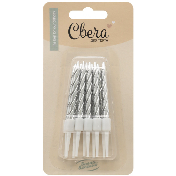 Стильно и недорого. Уникальный дизайн. Свечи Спирали, Серебро, Металлик, 0,5*6 + 3 см, 10 шт. с держат. Тематика: Общепоздравительные