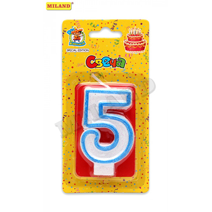 Стильно и недорого. Уникальный дизайн. Свеча для торта с синей окантовкой с блёстками Цифра 5 Тематика: Общепоздравительные